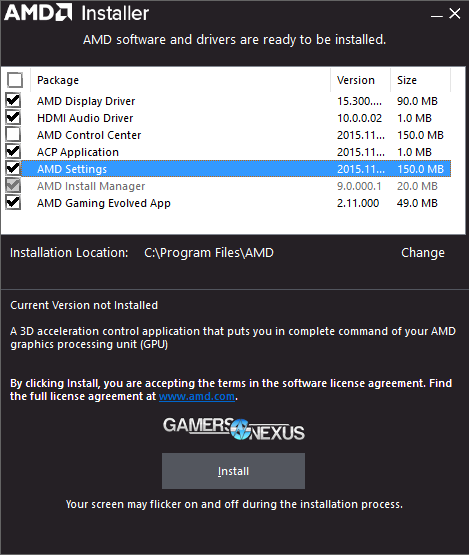 Install size is likely inflated for simplified distribution to the press, though we will be revisiting this as AMD rolls-out its official, public software. Our install package includes support for all versions of Windows and all modern AMD cards, landing it at a fairly large 1.1GB unpacked. Comparatively, 15.11.1 runs 478.6MB for the Windows 10-64 version. Fairly inconsequential once installed, granted, but unpacking does take about two minutes.