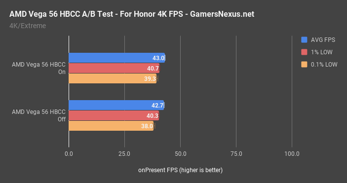 For Honor at 4K and using Extreme settings makes for one of the more memory-intensive games that we work with. Vega with HBCC enabled plotted a 43FPS AVG versus 42.7FPS when disabled, marking these scores functionally equivalent and within variance. The lows are 40.7 versus 40.3 and 39.3 versus 38. Once again, all of this is within test deviation and variance.