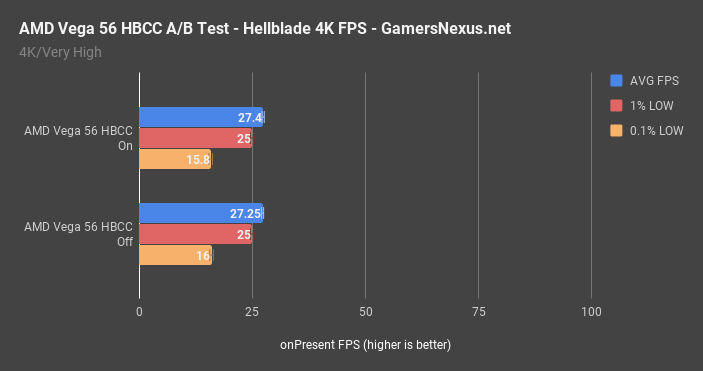 We configured Hellblade to 4K with Very High settings, providing one of the more taxing gaming tests for the Vega 56 card. Under both HBCC conditions, performance was exceptionally consistent and plotted at about 27FPS AVG, with lows at 25 and 16 for each set of tests.