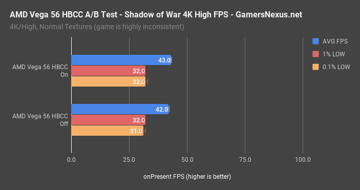 Testing Shadow of War with the normal texture pack, 4K resolution, and high settings had us at 42-43FPS AVG on both iterations of the HBCC testing, marking equal performance. We later enabled the 4K texture pack and ran Ultra settings, with HBCC reconfigured to a 12GB framebuffer to preserve RAM for the pack. Those settings gave us, once again, about the same performance between our HBCC on and off tests.