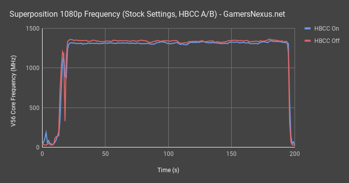 As for frequency when using stock settings, enabling HBCC plotted a stable frequency of about 1310-1325MHz for the first half of the test, while disabling HBCC plotted a more variable (but higher) frequency of 1315-1352MHz. This difference occurred frequently, and seemed contingent on the HBCC toggle. Although we could control for frequency to some extent, we also wanted to study the toggle’s impact on stock performance – this is part of that. Despite the slight frequency deficit on the HBCC enabled test, the card manages to improve performance a few percent.