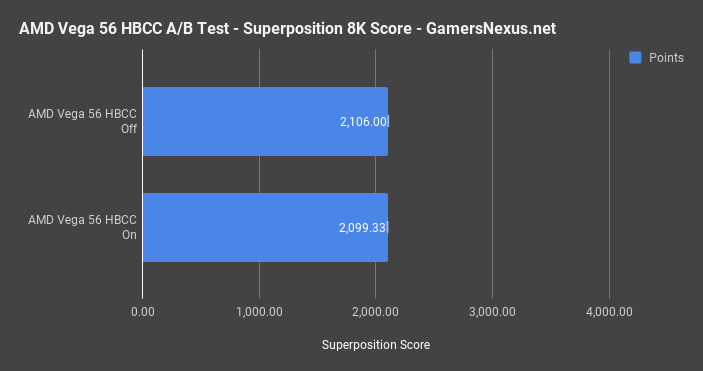 Superposition is our next synthetic test, offering a look at performance scaling from the eyes of Unigine, rather than Futuremark. Superposition wasn’t repeated as many times, but we do have five test passes for each configuration, with minor standard deviations of 2.9 points for HBCC on and 1.4 points for HBCC off. That’s against >3000 points total, marking this application as impressively consistent in scoring.