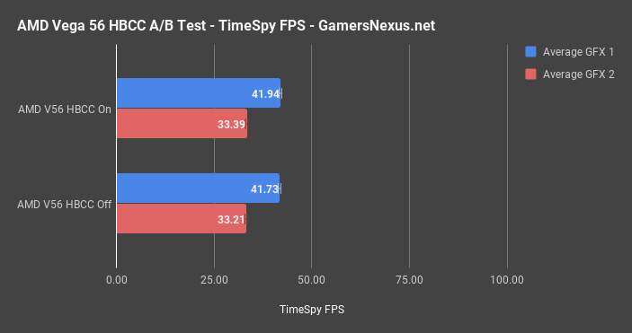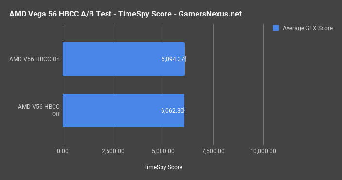 TimeSpy underwent the same treatment, using the same script for its repeated execution. We found much closer scores for this one, with the average graphics score at 6062.3 for HBCC disabled, or 6094.37 for HBCC enabled. That grants HBCC On an advantage of 0.53%, repeatably, and translates into a scoring of 41.7FPS versus 41.9FPS for GT1, favoring HBCC enabled, and 33.2FPS versus 33.39FPS for GT2.