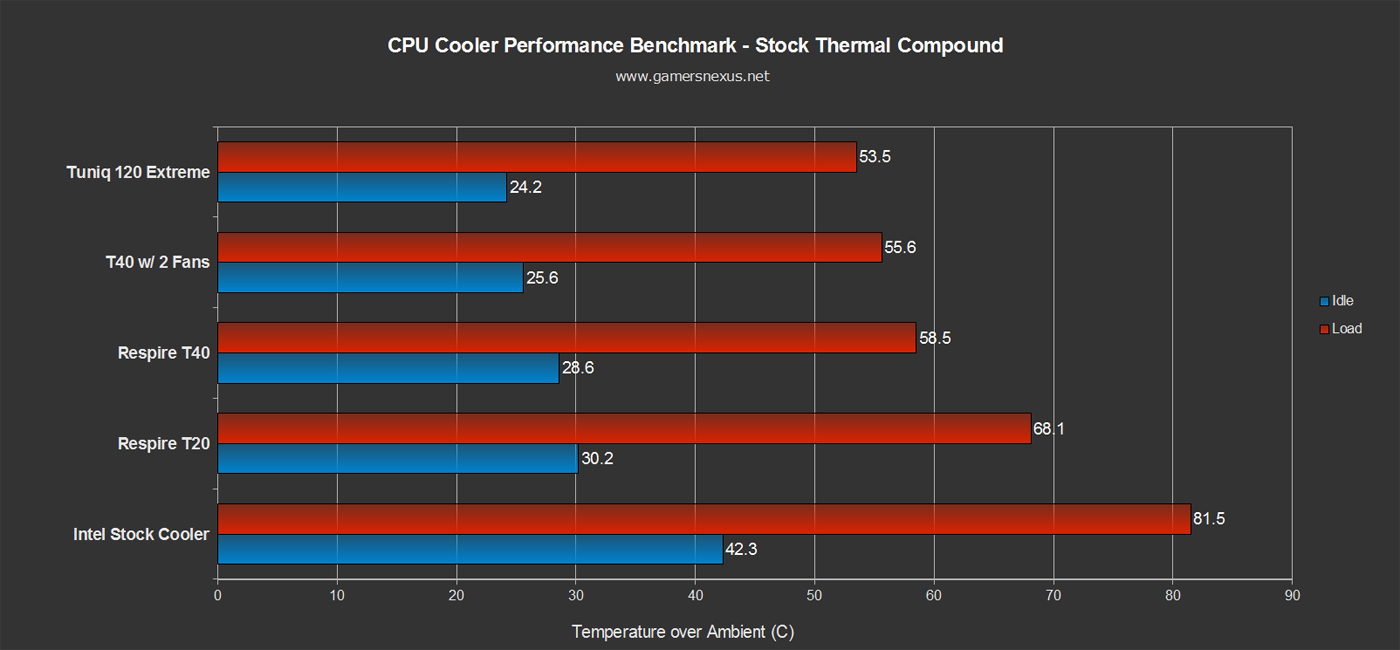 Case in point: We recently tested out the NZXT Respire T20 and T40 and noticed significant variation in thermal performance between compounds and heatsinks. Operating on an overclocked core i7-930 and an X58 board, the T20 struggled during load with the stock paste, but its temperature dropped dramatically when we substituted stock thermal paste for an aftermarket product. You can see in the graph below that the two coolers easily stayed below 60 degrees Celsius on load.