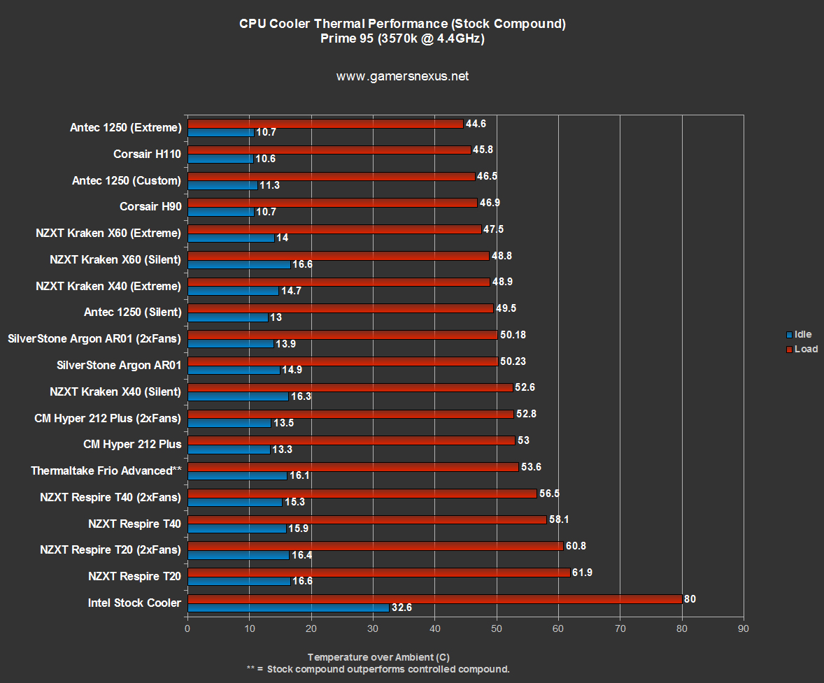 Antec handily claims the top of our bench. It's that simple: The Kühler 1250 is the best liquid cooler we've tested. Even at half speed (1500RPM), which is reasonably quiet, the 1250 still performs on-par with the fixed-speed H110 from Corsair. As I say in the video review above, "this is an easy pick-up, all day long."