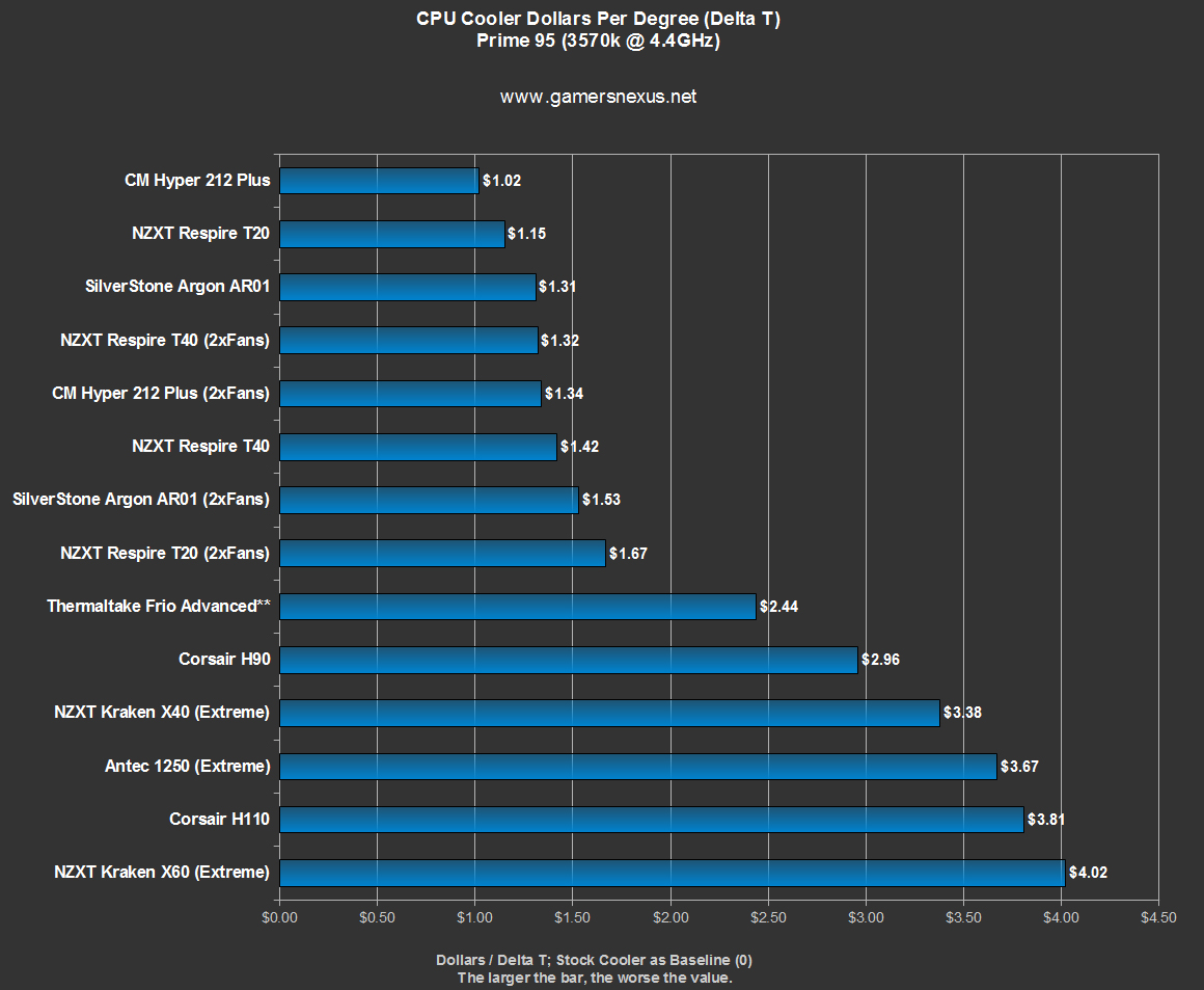 Our degree-per-dollar chart is measured by using the stock cooler as a temperature baseline. We calculate Delta T between the tested coolers and the stock Intel cooler, then divide price by Delta T (example: $65 / dT 28C = $1.85/degree C). This is used for buyers who are looking for a perspective on relative value and aren't necessarily after each individual degree. For value charts where coolers utilize two fans, we assume an average price of $8 per additional 120mm fan.
