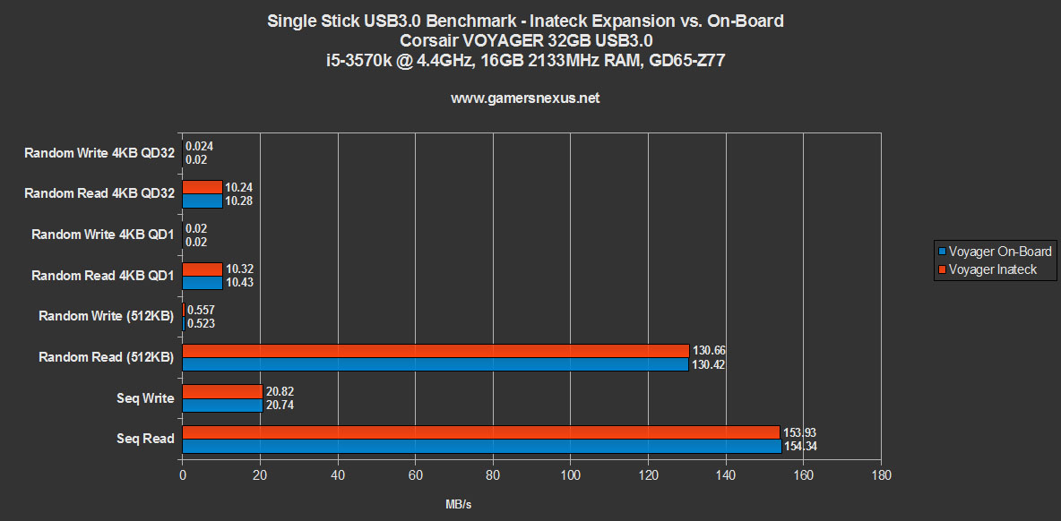 This image is one of the most uninteresting benchmarks we've ever produced. Shown here, Corsair's Voyager retains full speeds on both the on-board port and the KT4005 port, proving that it is in fact actual USB3.0 on the PCI-e expansion card. Any disparities are largely within margin of error.