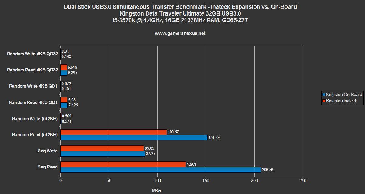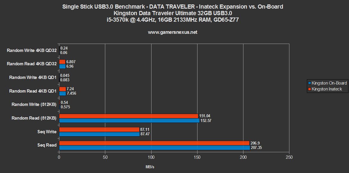 The DataTraveler is a bit faster than the Voyager, but as long as we're establishing baselines, that's fine. Each device was tested individually and independently using the on-board USB3.0 port and the KT4005's USB3.0 port, using HD Tune Pro and CrystalDiskMark to test throughput. After these tests, the devices were connected simultaneously to the board and to the KT4005 card, then attacked with simultaneous disk benchmarks. The idea here is to challenge the maximum throughput of the USB3.0 controller and the device, ultimately determining whether it can truly handle more than one simultaneous mass file transfer.