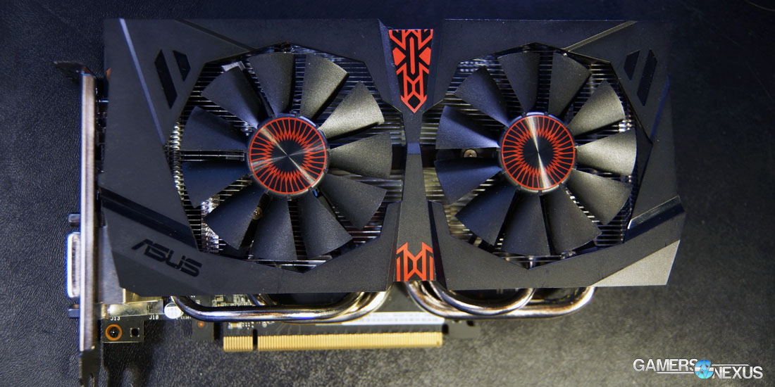 The Strix is among the smallest cards, dwarfing only PNY's XLR8 Elite. To this end, it's a versatile performer with applications in small form factor (SFF) enclosures that demand minimal space consumption. The Strix is designed to front an owl-like visage, using dual fans for the “eyes” and plastic molding for the “face;” the fans, as with all GTX 960s we tested, will spin down to 0RPM (outputting 0dBA) when insignificant load is detected on the GPU. The fans won't spin-up until the GPU exceeds 30W power consumption, ensuring silent operation when playing low-demand games like LoL.