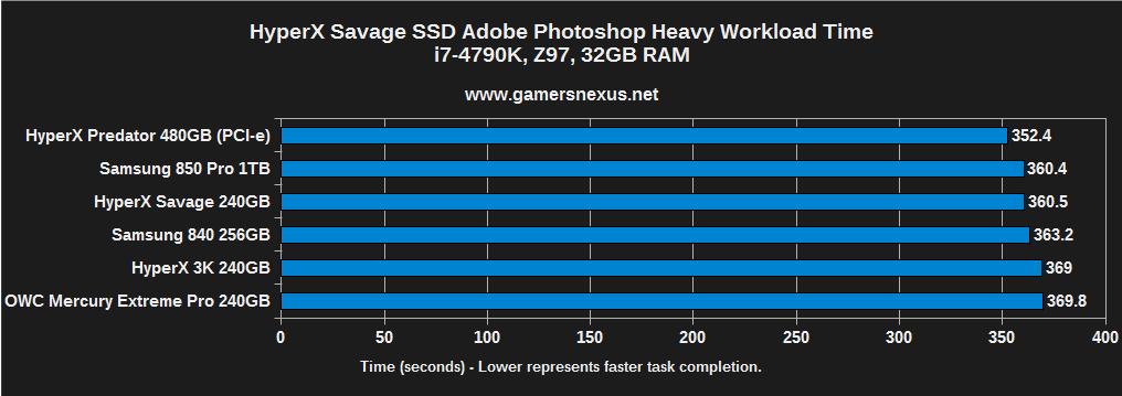The Savage SSD performs impressively well with Photoshop tasks. It's pushing nearly the same workload time as the 850 Pro, an SSD slated for prosumer use, and costs just slightly less at the low-end (though Samsung's 850 Pro is cheaper at the 1TB level).