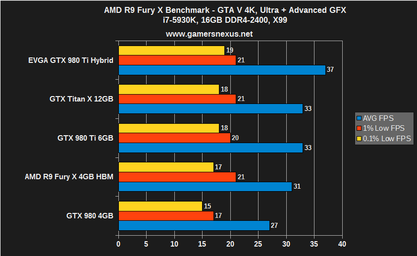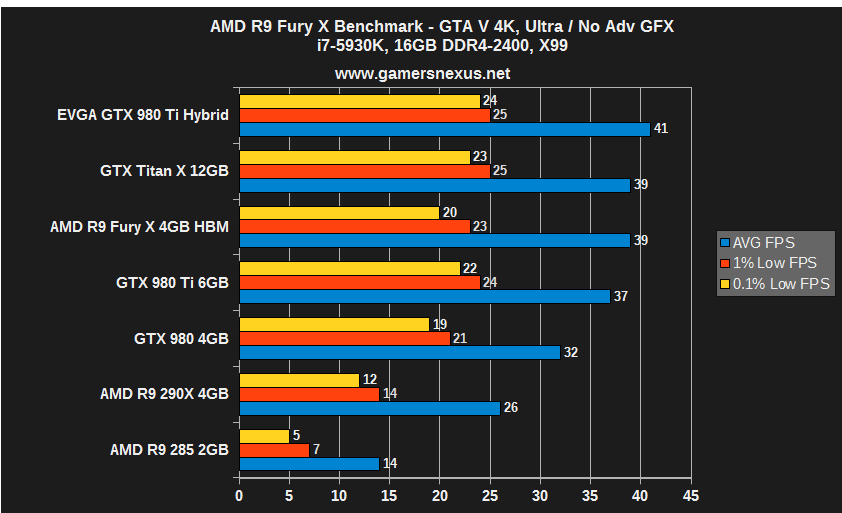 With or without Advanced Graphics enabled, none of these GPUs are particularly capable of playing GTA V at 4K. Stress testing, though, we see that the Fury X has more difficulty keeping up as memory demand is increased. With 4K Ultra and no Advanced Graphics, the Fury X remains more competitive with the GTX 980 Ti.