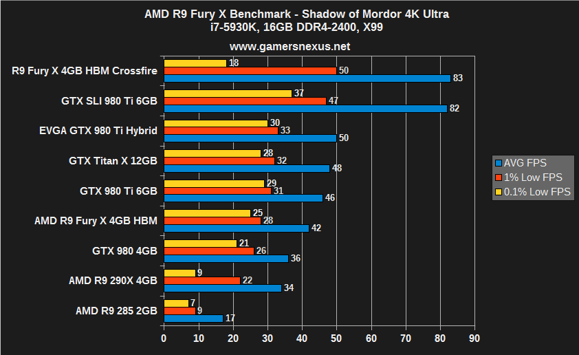 Despite its 1FPS performance gain in averages, the Fury X is the worse card of the two primary contenders for Mordor. Its lows are spiky enough to hinder fluidity of gameplay in a fashion that is noticeable to gamers.