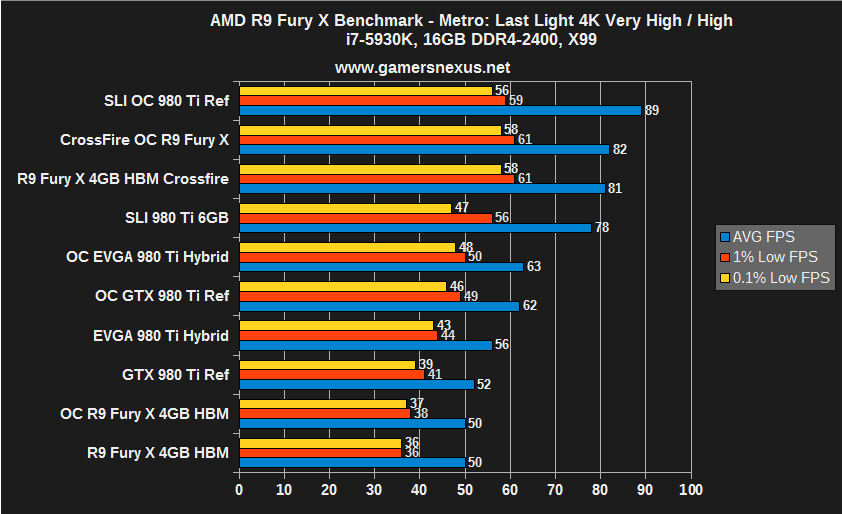 As seen, there's generally no worthwhile gain from overclocking the Fury X. The 980 Ti shows large, game-impacting gains from its overclocks (52 to 62FPS average, for instance, in Metro with bolstered 99 and 99.9 percentile performance).