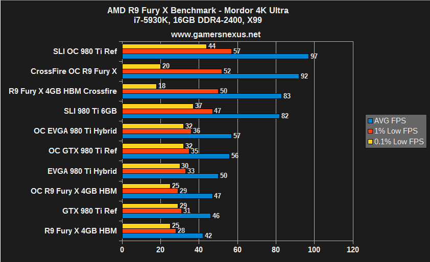 The GTX 980 Ti holds higher performance metrics across the board for Shadow of Mordor, sans raw FPS against the CrossFire config. Unfortunately for AMD, though, the 0.1% lows are abysmal at 4K and suffer slightly at 1440p. This produces more choppiness and noticeable 'gaps' in fluid gameplay on the Fury X, something we don't see much of on the GTX 980 Ti. The Fury struggles particularly hard at 4K, dropping to 18FPS 0.1% lows.