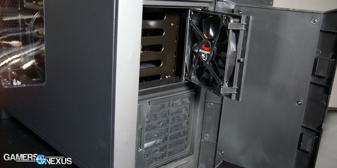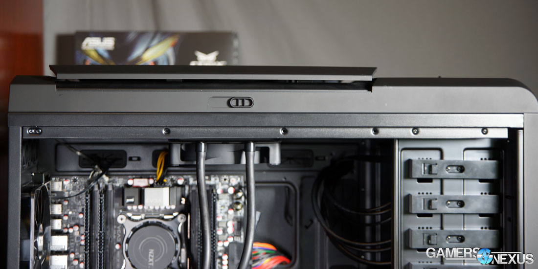 Unfortunately, a 140mm radiator will not fit in the rear slot due to a curved bezel protruding from the expansion slot area (though it is also not advertised to fit), so we had to go with a top-mount. The front radiator position is far enough away from the fans (and covered by drives) that we'd recommend using a top-mount instead, as the direct fan contact will drastically improve dissipation performance of the radiator.