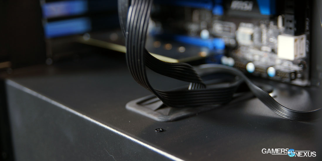 Thankfully, PCI-e cables can be routed straight through the PSU shroud; it's actually somewhat required, since the space between our full-size ATX PSU and the HDD cages is small enough that there wouldn't otherwise be management space. And that's not to mention the fact that the PSU barely fit within its compartment – it'd be easier with, say, a Corsair CX600 or similar PSU, but the case plainly lists support upwards of 220mm (what isn't as obvious is that the HDD cages would have to be removed to actually support this size). Our PSU isn't that long, though – it's 180mm, well within normal sizing for well-equipped ATX PSUs. It's also not the length that was primarily problematic with the Gungnir, it was the height. The Gungnir, like the Eclipse P400 from Phanteks, scrapes along the top of the PSU if not installed with the greatest patience. The bottom-front mounted HDD cages then block cabling, so (again) the point of the PSU shroud is somewhat sacrificed – especially since a good portion of $65 case buyers won't have modular PSUs. This is something we tried to explain to SilverStone at CES. Even just removing one of the HDD cages would free-up enough space to stuff excess cables somewhere; presently, there's just no room to maneuver in the Gungnir, the P400 is the same, and we fear that SilverStone may also fall victim to this oversight.
