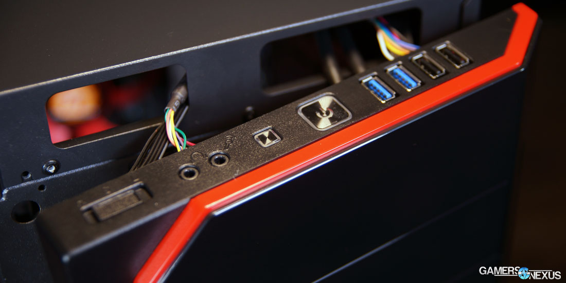 A key signifier of limited QC or design oversight is the consistency of paint color; the Gungnir uses three different tones of black in a one-inch square area. The steel top panel is a gray-black color, the plastic front panel (top, near the IO) is a darker black, and the front of the front panel is a glossy, pitch black. We only mention this because it's not intentional, and that's clear to us as veteran case reviewers. The black tone difference between the steel and plastic paneling is a result of poor color matching through the material change (plastic and steel respond differently to the same paint). A very small mark against the case, but that's just to get us rolling.