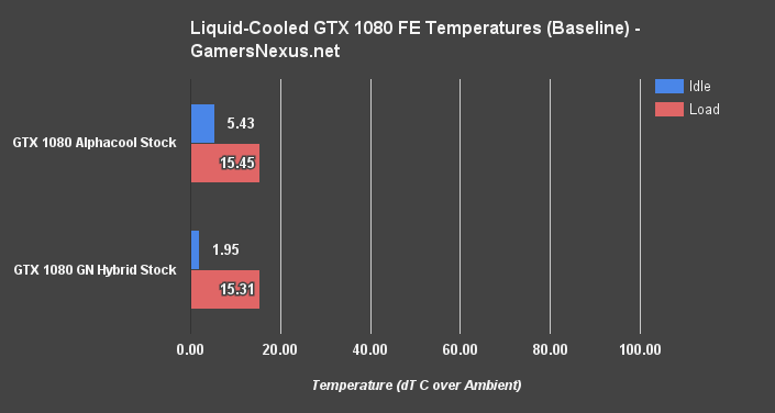 For baseline GPU temperatures, we’re seeing the Alphacool GPX Pro idling at 5.4C delta T prior to any testing. This compares to about 2C delta T on the GN Hybrid build. If you’re wondering how that makes sense, here’s why: There are two things that increase the GPU diode temperature of the GPX Pro. The first is that the GPX Pro is a full plate, so we’re sinking the VRAM, VRM, and even back-side PCB temperatures into the same cooling solution. The second is that the Alphacool unit is connected to the Eisbaer cooler, which means we’ve got the CPU on the same loop. The CPU has to be first in this particular loop, so even though it is idle and not producing any heat, the liquid temperature is going to be a little bit higher.