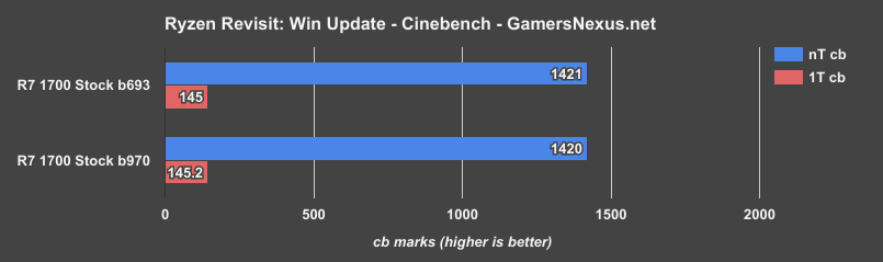 We run a few Cinebench passes and average them, with the tests generally showing a swing of a couple points from one to the next. We’re looking at 1420 vs. 1421, which is a statistically insignificant performance difference between Windows versions. 1T performance is identical, at 145 for each build. The Windows update does not appear to have impacted the R7 1700 numbers running on b693.