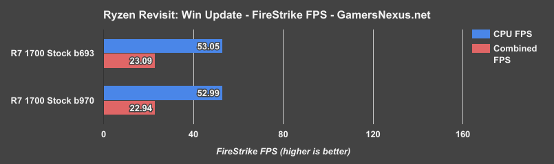 Above is the FPS chart for a Firestrike pass, showing differences of ~0.06FPS on the CPU portion of the test. This is, again, statistically insignificant. We are within test variance of the software more than the OS, and so it is fair to say that b693 and b970 are effectively equal in performance for FireStrike with this configuration.