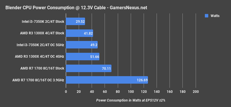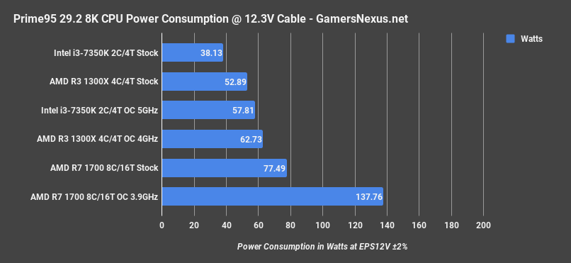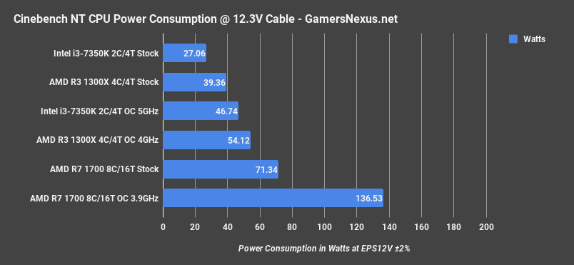 Power testing is something we only just added when working on Vega, so we’re working on porting power testing over to X299 and other CPUs. For the meantime, we’ve tested the R3 units, the 1700, the 7350K, and we’re adding a couple others on as we go. Again, this isn’t at the wall measuring – we are clamping the EPS12V outputs. We won’t have a full list of components tested for power consumption immediately, but it’s on the way. This is our debut of our new CPU power consumption testing.