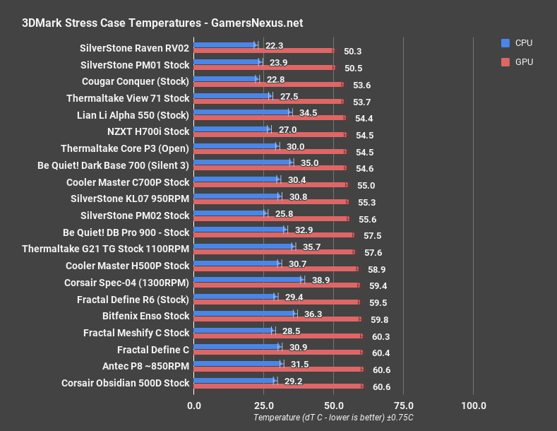 Baseline GPU torture temps averaged 57.3C. Taking off the front panel lowered this to 52.8C, and mounting the GPU vertically raised it to 63.2C, surprising nobody. Again, these are best used for open-loop cooled cards. Vertical mounting next to a side panel is never good for GPU air coolers, and that goes double for this case since we had to strap it in with zip ties. Adding the Noctua fan raised GPU dT to 60.7, possibly because of the top-heavy airflow pattern created by only installing fans in the uppermost slots with no air directed below the GPU. We also believe the temperature increase is primarily resultant of the fan reconfiguration: The higher pressure 120mm fan was moved to the top of the case, and the 140mm fan isn’t positioned in a way that dumps as much air into the front of the card (more goes over the backside).