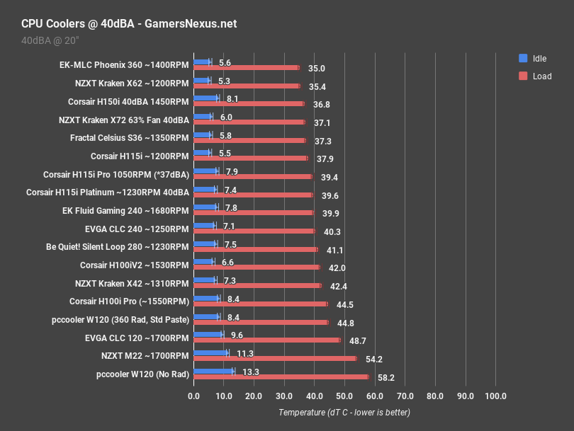 For the fuller chart now, the H115i Platinum at maximum pump and fan RPM puts it at 35 degrees Celsius over ambient, which has it as functionally tied with the EVGA CLC 240 at its maximum RPM of 2500. This difference is the result of EVGA’s aggressive fans, which hit 58.1dBA to Corsair’s 49.1dBA on the Platinum at max speed. The two achieve the same thermal result, but Corsair’s achievement is done at a much lower noise level. Its $160 price is also more expensive than EVGA’s $100 CLC 240, but the extra radiator and fan size does benefit its noise levels significantly. More fairly compared, the H115i Platinum also competes closely with NZXT’s Kraken X62, which has performance within our error margins. It’s also near the H150i’s 35.5-degree result, equipped with slower fans, and not distant from the original H115iV2 at 1500RPM, ranking 35.8 degrees Celsius over ambient.