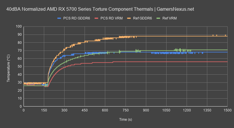 Looking next at GDDR6 and VRM MOSFET temperatures under the same 40dBA noise-normalized configuration, the PowerColor Red Dragon GDDR6 measurement reads an average of 68 degrees Celsius, with the VRM MOSFET measurement at 57 degrees. This is way below spec and is well-cooled for both. The MOSFET can handle well over 100 degrees and the GDDR6 module can take a bit over 100, so we’re not even close to danger even in a worst-case chassis. The reference card reported a GDDR6 temperature of 88 degrees, with the MOSFET at 71 degrees. The GDDR6 modules are getting heated, here, and transplanting into an actual case would start to push the capabilities of the design if trying to retain a lower fan noise. If allowed to run Auto, yes, the 5700 blower cooler could handle it, but you’d also be looking at 50+dBA of noise at a 20” distance, by our measurements. In the end, it’s all about comparatives: The Red Dragon card, comparatively, is doing much better here. It’s just a question if other partner models beat the Red Dragon.