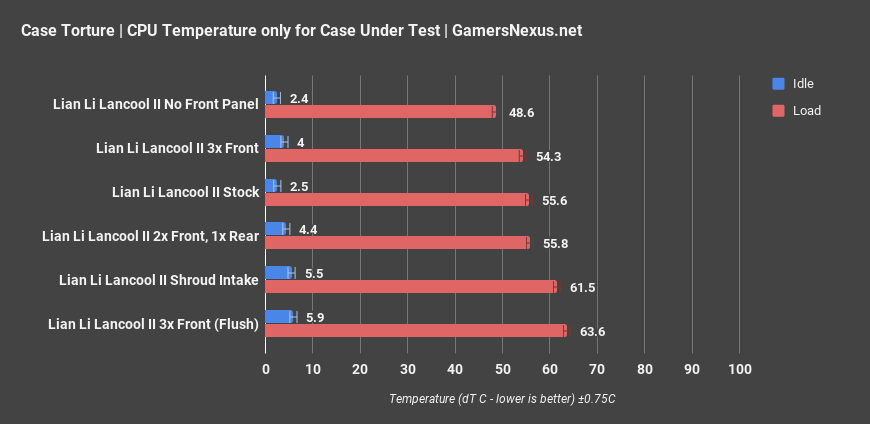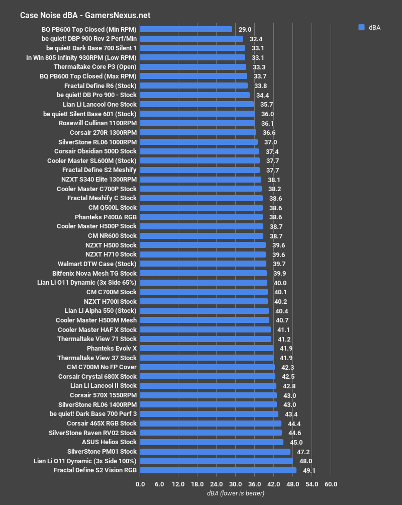Our standardized fan test was added this year, but the chart continues to grow with each review. For this test, we replace all the stock fans with three Noctua fans, two 140mm and one 120mm, and ideally configure them as we did in this case: We set the 140mms as intake and the 120mm as exhaust, noting critically that this test sometimes worsens performance of cases which are already well-optimized for their stock configuration. This is thus far rare, but happens sometimes. The Lancool II averaged 53 degrees CPU dT with these fans, about 3 degrees better than the stock test. Compared to our other cases, that’s still warmer than the median, on par with the NZXT H500 or the ROG Strix Helios. The mesh-fronted cases like the Meshify C are generally cooler, but not incredibly so for some of the more restrictive ones, like the 51.9-degree Nova Mesh TG.
