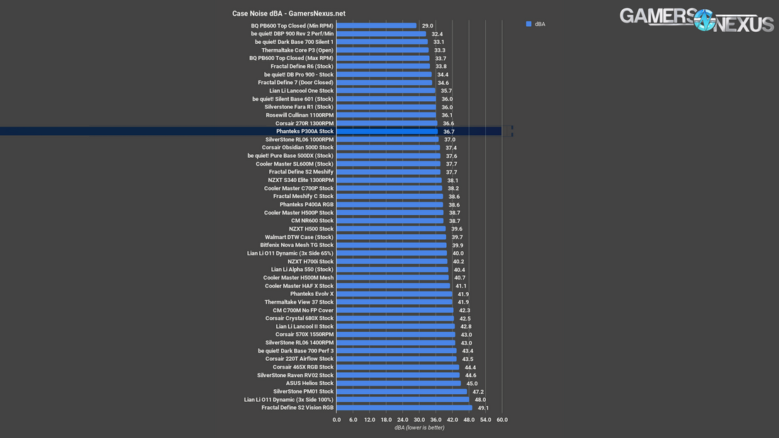 Including only one fan in the case makes the P300A relatively quiet, but thanks to some audible vibration, we measured the noise level to be 36.7dBA at max fan speed, just slightly above the threshold for our noise normalized testing. Lowering the fan to 90% speed, or approximately 1270RPM, quieted this vibration, but the thermal results were predictably terrible.