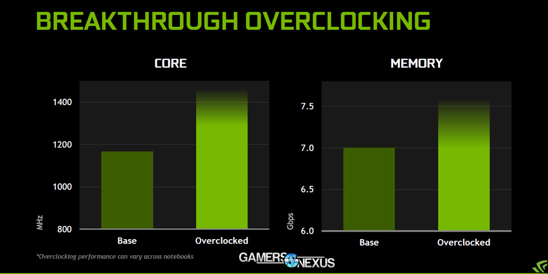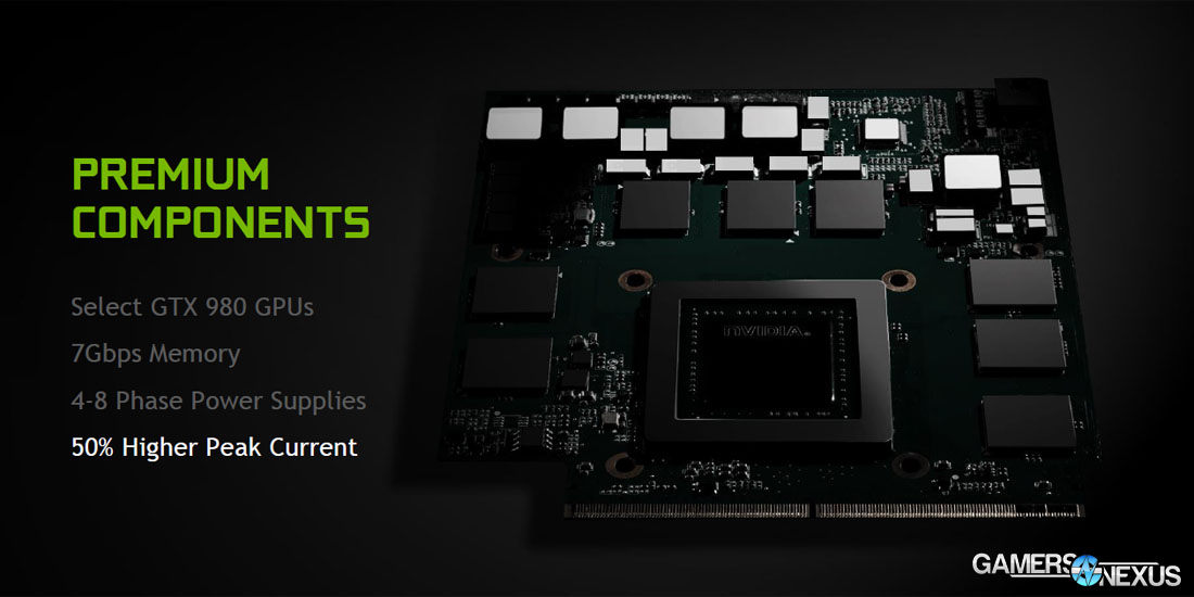 We're told that the GTX 980s shipping in new notebooks will be binned, with chip selection based upon the high standards for performance and thermals of the notebook units. NVidia reiterated that the portable units will use, quote, “premium components,” to include a minimum requirement of 4-phase VRM design and a strong recommendation of using unlocked mobile CPUs. Some notebooks will host 8-phase VRMs, which will aid in thermal reduction by dissipating voltage regulation across twice as many phases. This also helps support overclocking endeavors – another big focus of the GTX 980 notebook GPU.