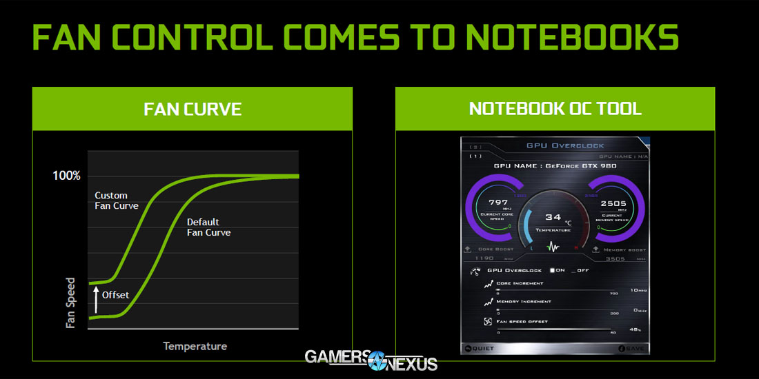 Notebooks are generally sold as a black box, which is understandable. Fan speeds are set and user modification is effectively disabled, ensuring that the laptop modulates its fan speed as its thermal needs demand. The GTX 980 removes this restriction by introducing fan speed control through an overclocking tool (provided by nVidia for reskin to manufacturers), which allows custom fan curve configuration and OC management through sliders.