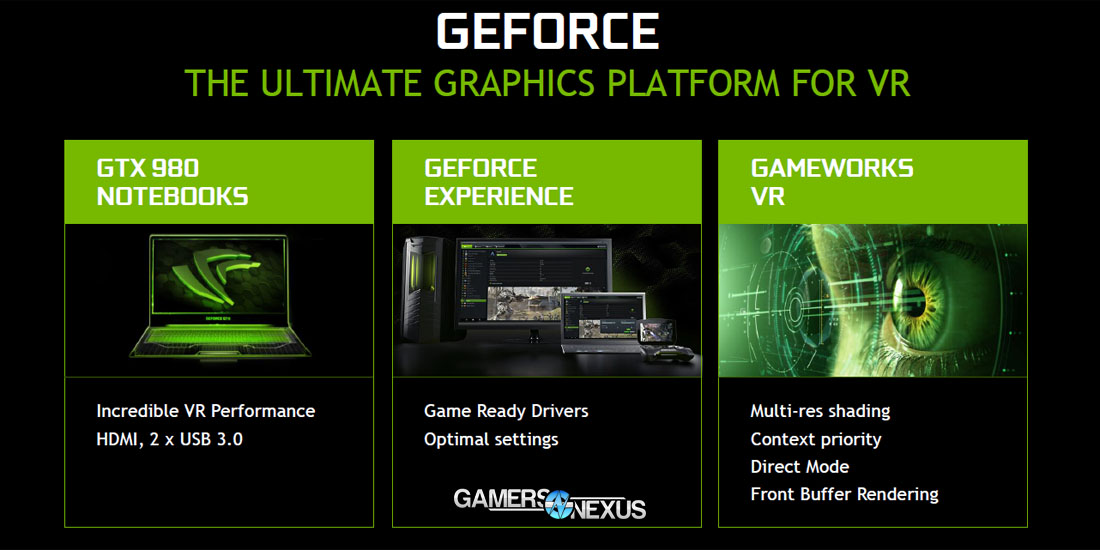 A quick note: As indicated in the accompanying slide, nVidia has also been pushing the possibility of more powerful, mobile VR support with the GTX 980 on laptops. Vendors may find this of particular interest, providing a more portable convention deployment for VR demonstration.