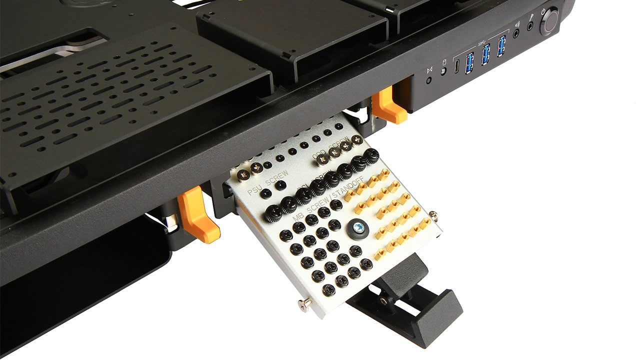 In all seriousness, it is a nice looking enclosure: Three fan ports with radiator support, all blasting at the GPU, aluminum housing for drive installation, an aluminum support beam underneath (can be stood vertically), and internally routed cabling for the front-panel connectors. Granted, those are a bit pointless in an open air bench.