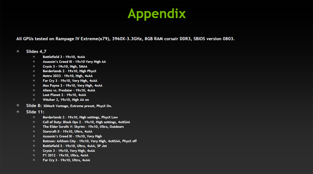 And that was nVidia's key phrase for the conference: Optimizing for the gamer. They want a better "pruduct for the core gamer," and realized that the key price-point is below $200, so here we have the "Boost" suffix added to the original 650 Ti, a few added features, and some FPS increases in-hand with these upgrades. NVidia's internal testing (we have not yet validated) resulted in the following: