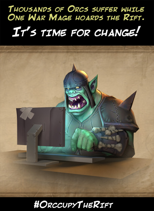 Orccupy the Rift is a movement that started out on Twitter, as with many modern rebellions, and is spreading rapidly to other networking websites. While it is uncertain whether or not Orcs know how to use computers, one thing is known: Orcs are dying en masse thanks to the recently-elected warmages; supporters of the Orc party have often referred to a previous warmage, known only as "old man," stating that we should have never impeached him.