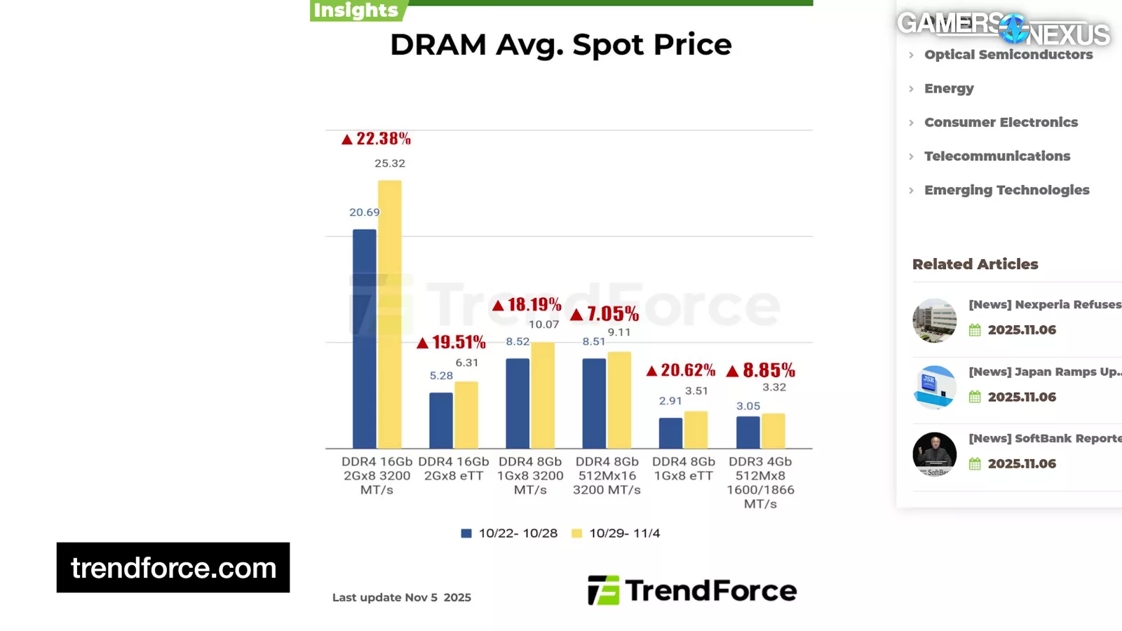 In some of our price checks today, we found memory kits increasing by 169%, 116%, 181%, and similar. By hard dollar amount, some of these have gone up by 100s of dollars for a kit of 32GBs in a span of just one to two months. Higher capacities have gone up by $400 or $500 in some cases. At one point, we observed a 1% increase per day for 13 days. There’s even new reports that these recent price increases are to blame for NVIDIA’s potentially delayed unannounced Super Series refresh with worries that the company will prioritize denser GDDR7 modules for workstation GPUs.
