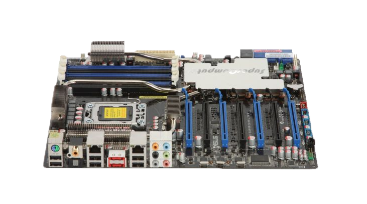 This insane motherboard is truly top-of-the-line. The ASUS P6T7 WS Supercomputer X58 Motherboard comes with seven PCI-Express slots, Max capacity of 24 GB of RAM at DDR3-2000 (OC), and the ability to bear the behemoth Intel Core i7. Slap four GPU's into those slots, a Core i7, some sick ram, and you've got bragging rights like no other. The board (as seen above) also comes with a decent heat-piping system, and some moderate built-in heatsinks. You can look forward to two external and six internal SATA Ports, six USB Ports, and triple-channel RAM compatability.