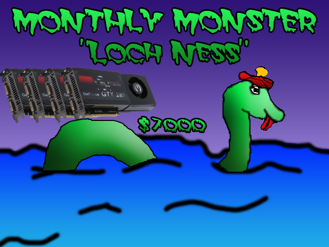 The rightfully named "Loch Ness" Monthly Monster is dubbed so from its build. This mammoth comes fully equipped with liquid cooling, 4 GPU's, 12 GB of triple-channel RAM, and 3 freaking 15,000 RPM hard drives! The gamer who claims this machine as his own is truly hardcore (and rich).