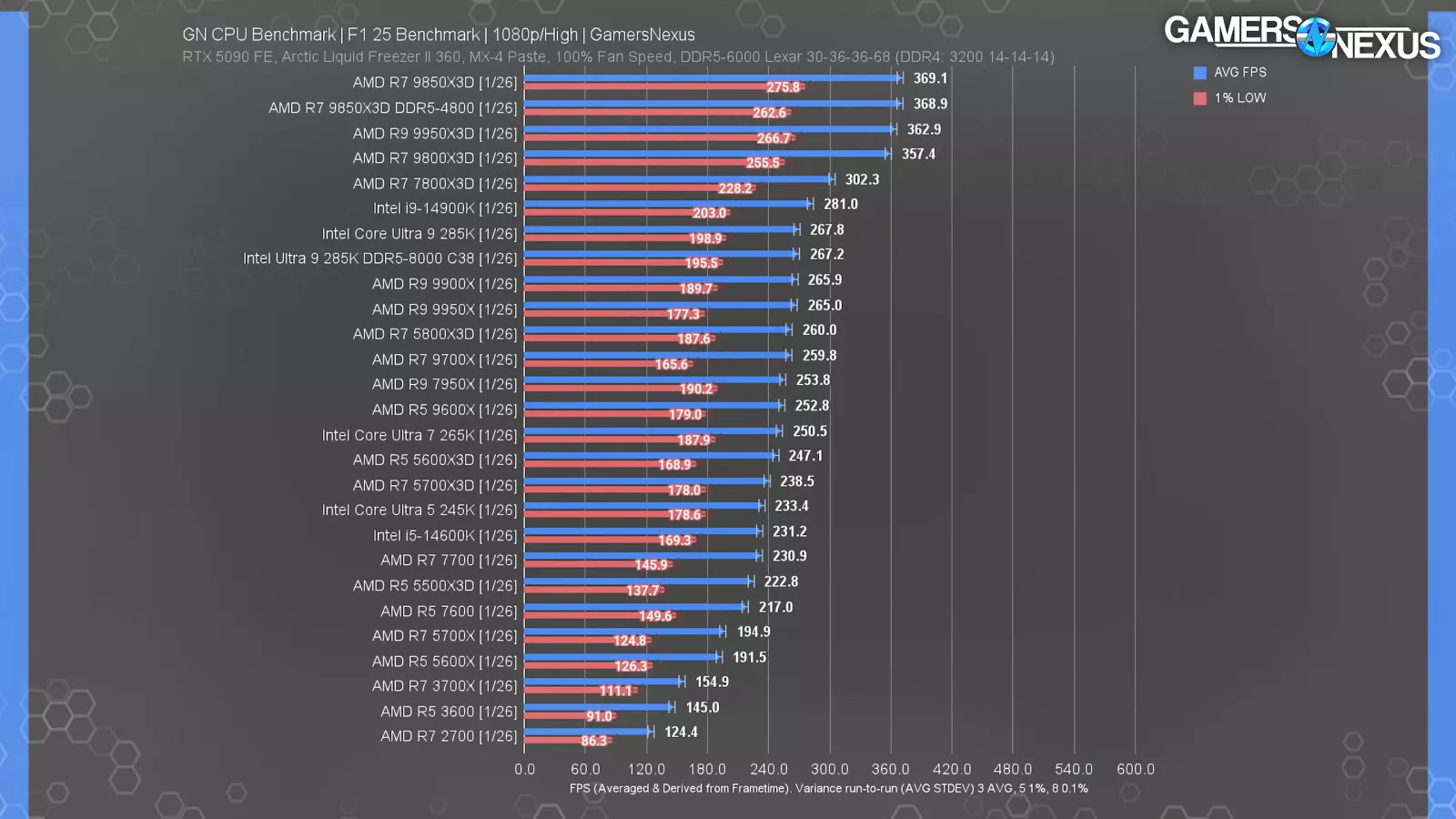 In F1 25 at 1080p, the 9600X reached 252.8 FPS AVG, or 16.5% faster than the previous gen Ryzen 5 7600 (non-X). The 9600X barely edges out the lead in a functional tie with the Intel Core Ultra 7 265K. The ~85$ gulf in favor of the 9600X renders the 265K meaningless in this comparison.